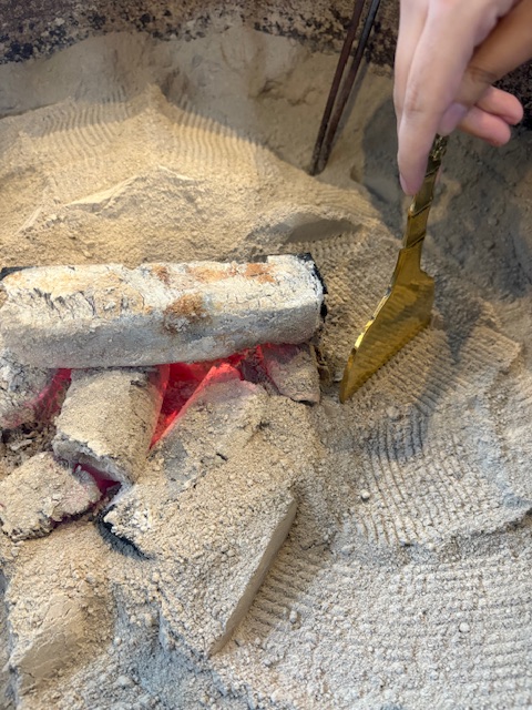 火鉢の灰を整え、綺麗な波模様が出来る。
